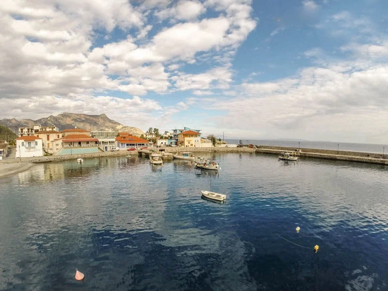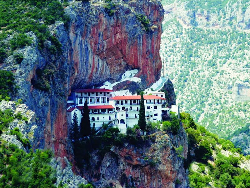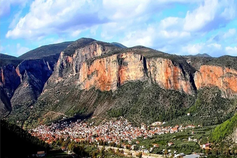 The blue of the sea, the green of Parnon and the red of the impressive vertical rocks meet in Leonidion.